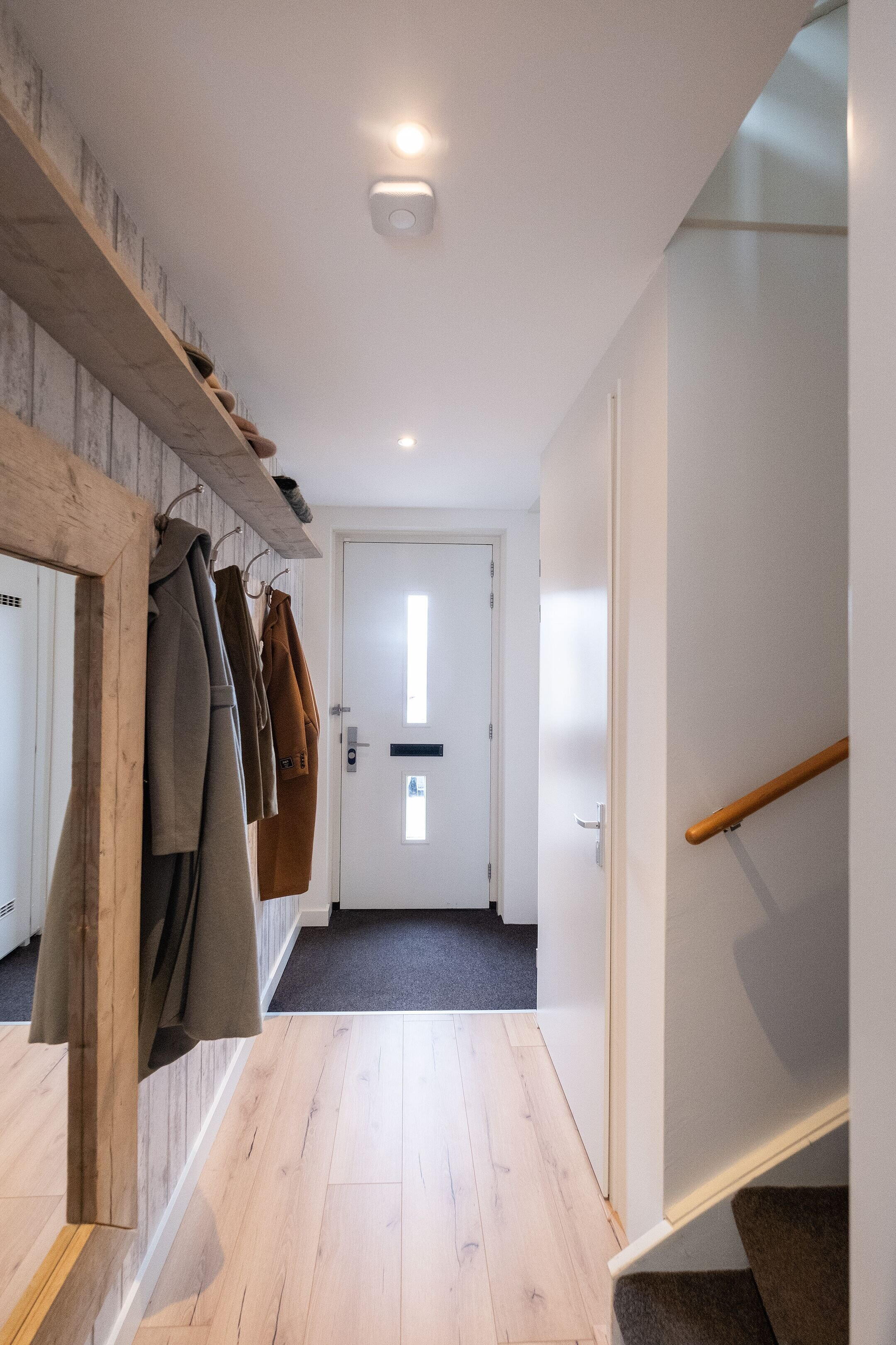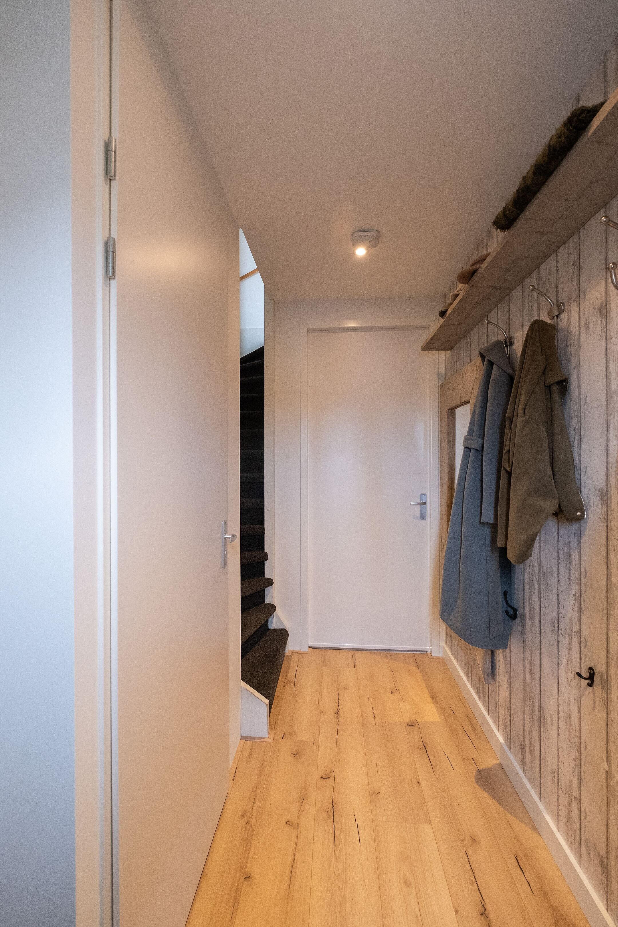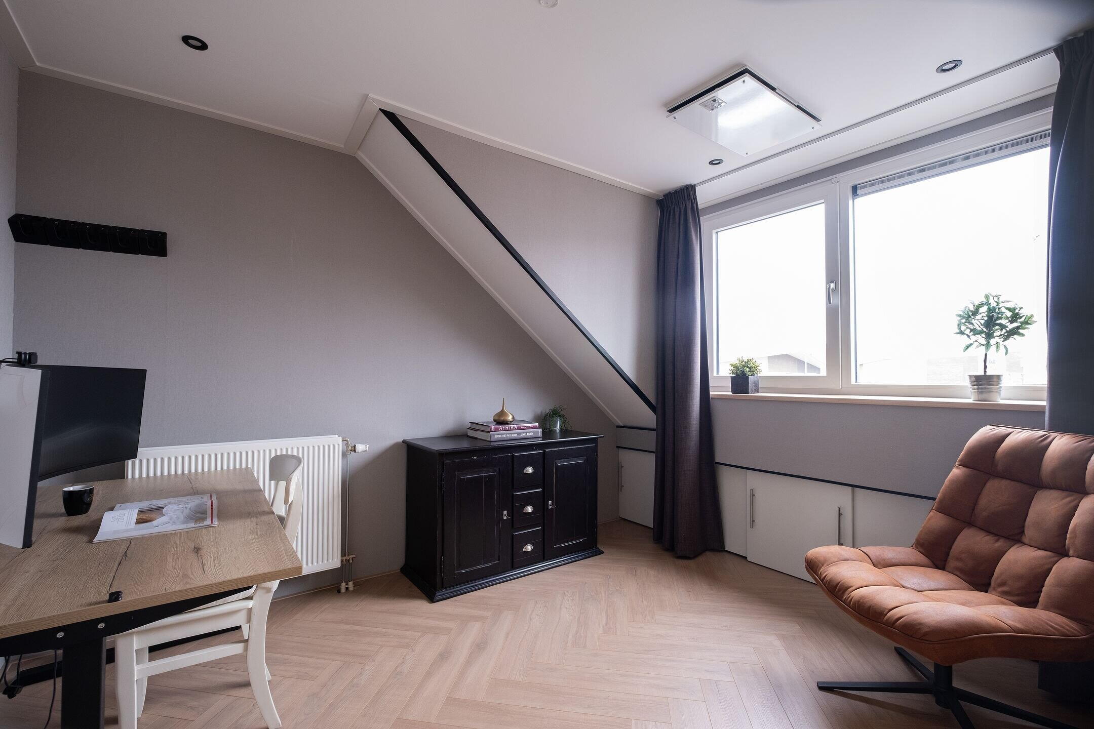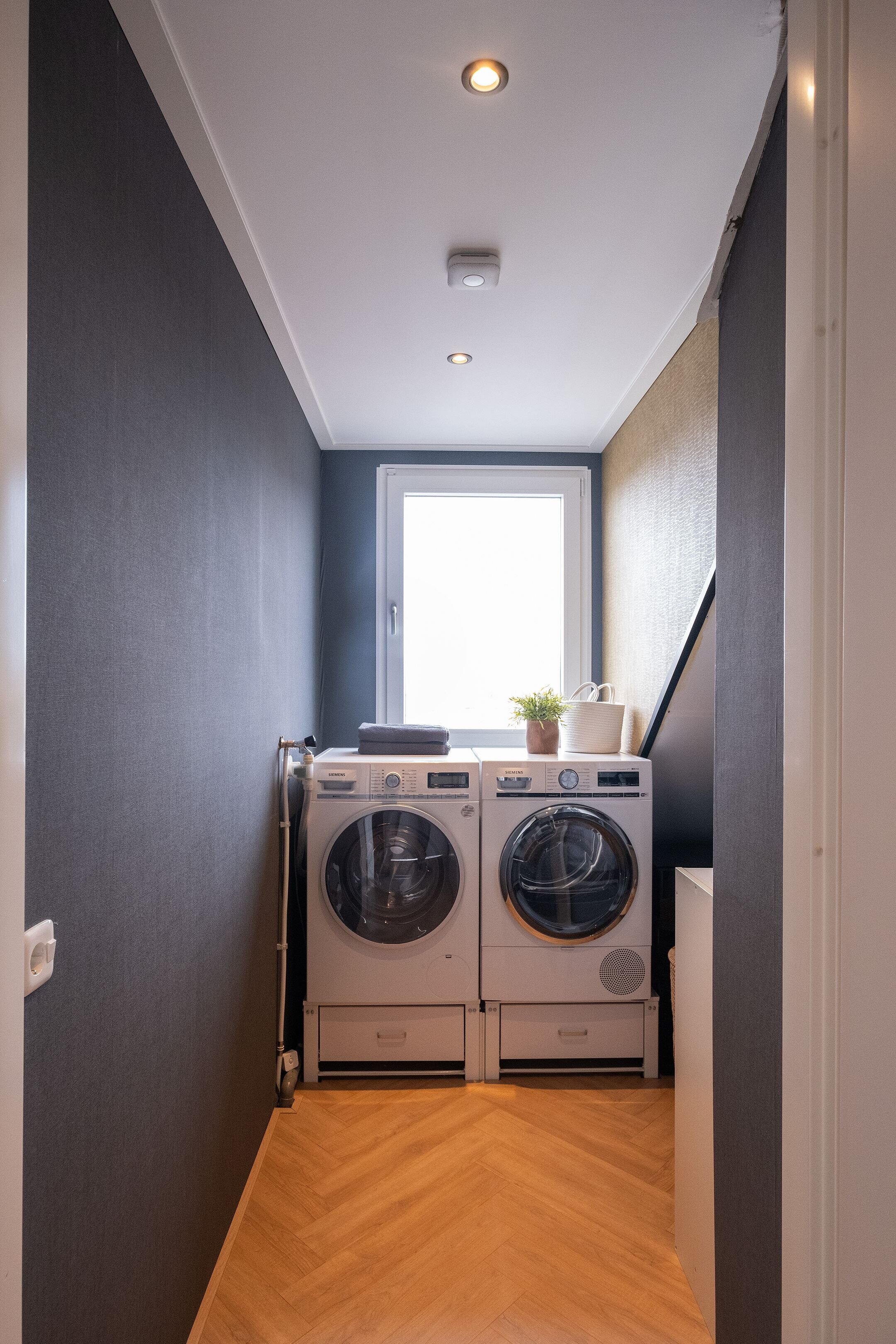 Daarnaast is er een aparte bergkast met de aansluitingen voor wasmachine en droger, de cv-installatie, mechanische ventilatie en de omvormer voor de 18 zonnepanelen. Extra bergruimte vind je op de vliering, die over de volledige breedte van de woning loopt en bereikbaar is via een vlizotrap.