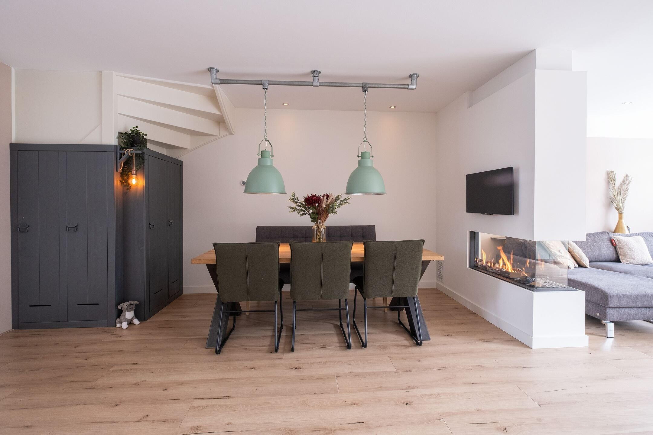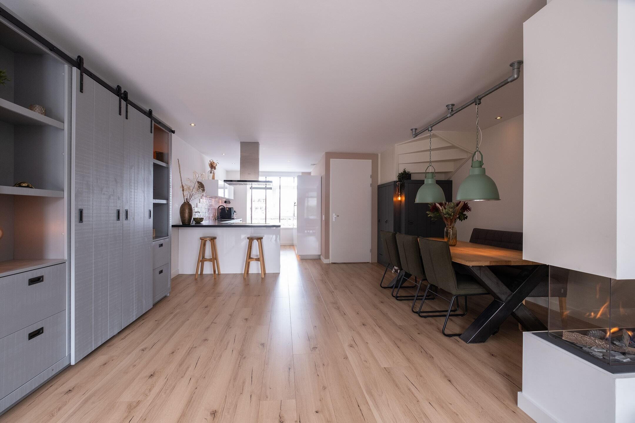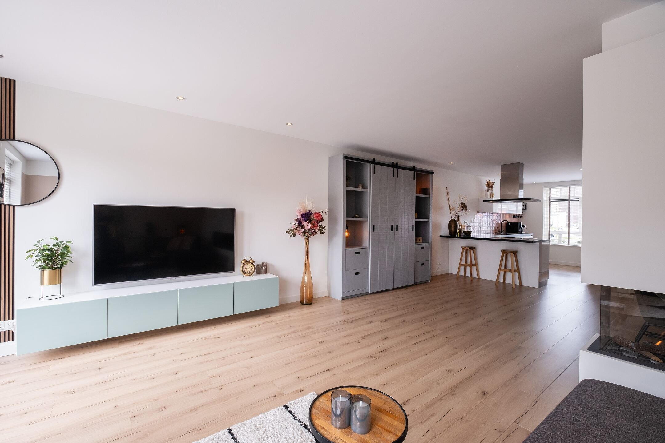 Via de entree kom je in de hal met meterkast en trapopgang. De woonkamer is door de uitbouw heerlijk ruim en licht, met openslaande deuren naar de tuin. De ruimte is strak afgewerkt met glad gestucte wanden en plafond, een laminaatvloer met vloerverwarming en een stijlvolle cinewall met gashaard en spotverlichting.