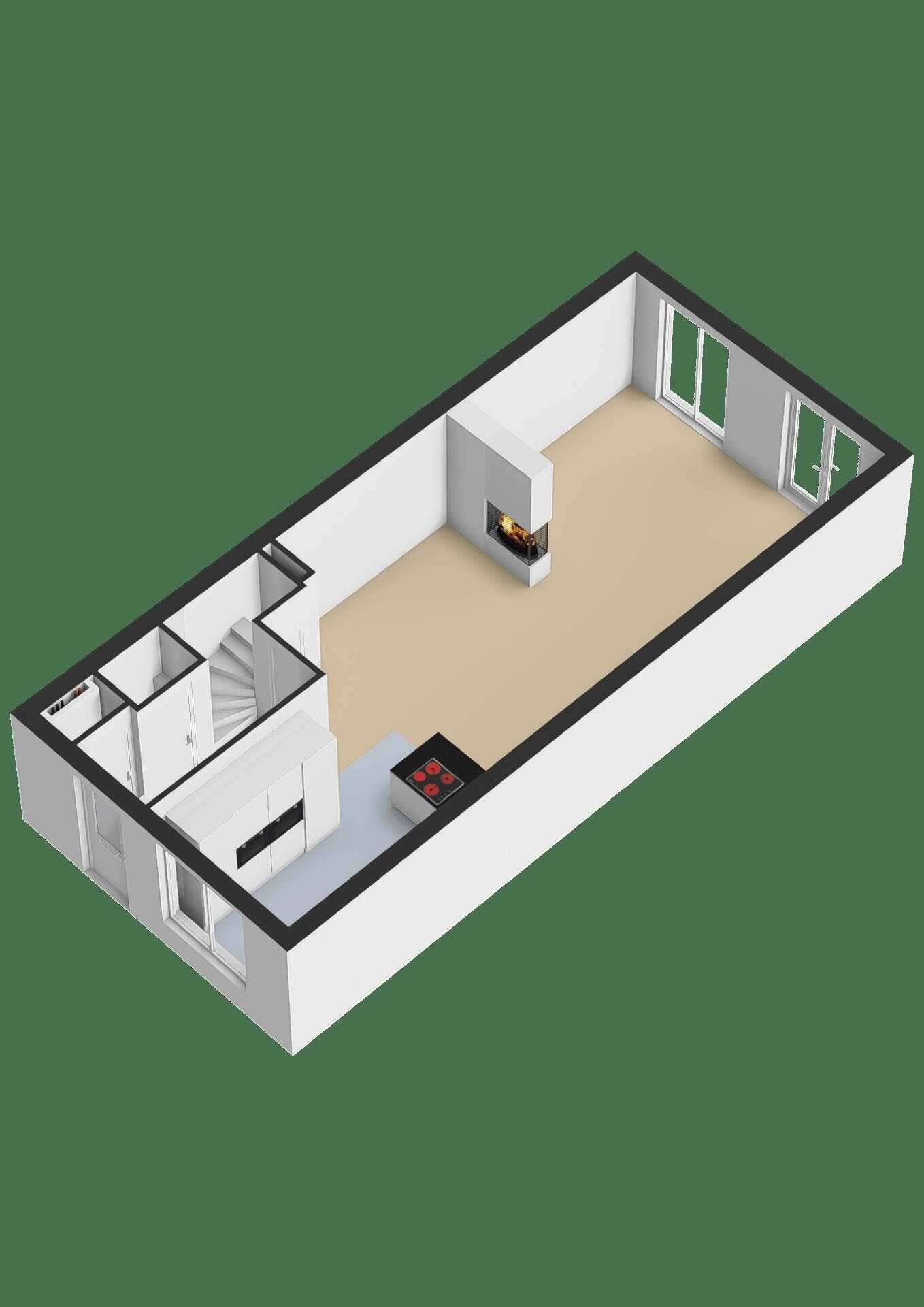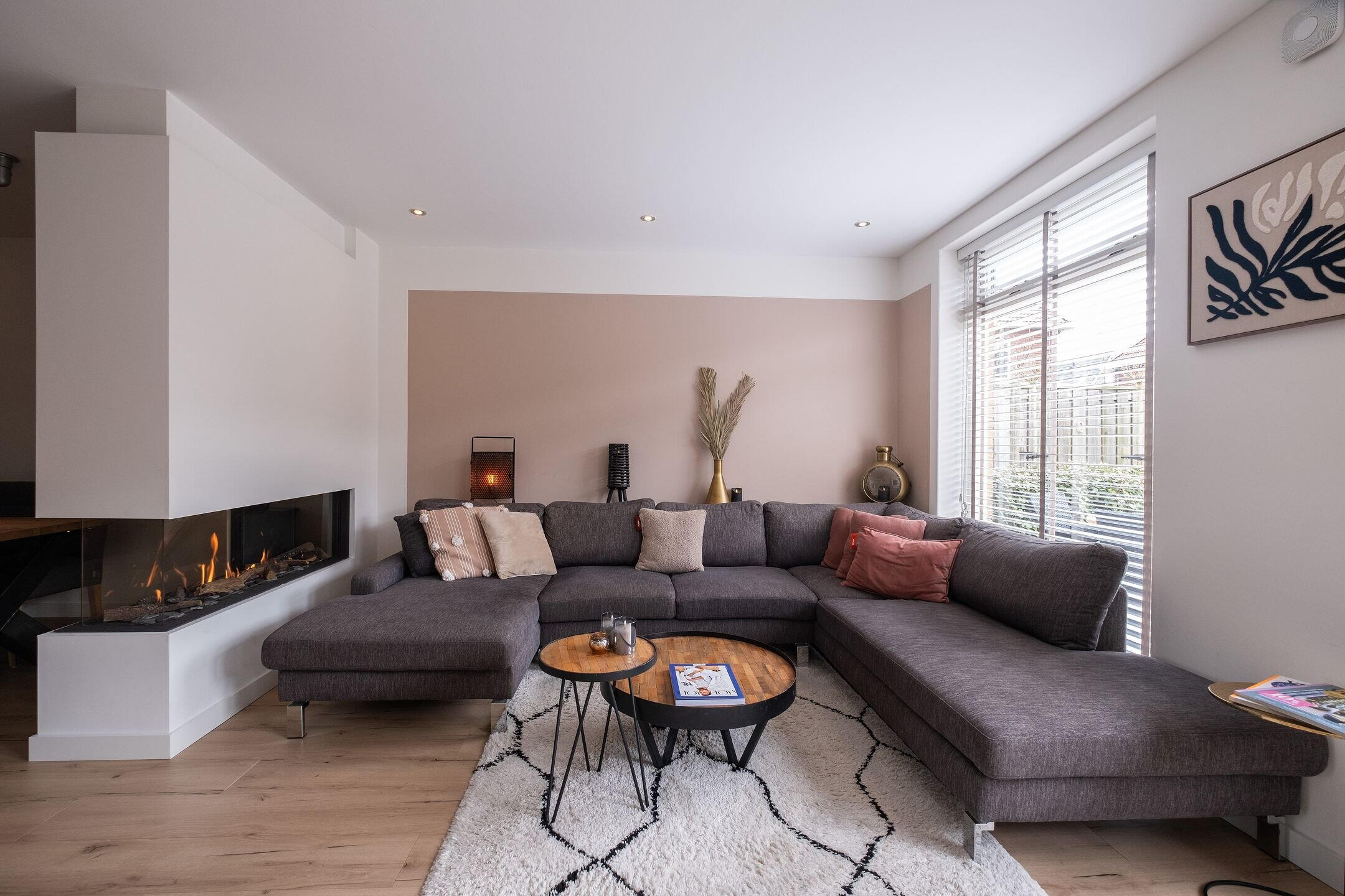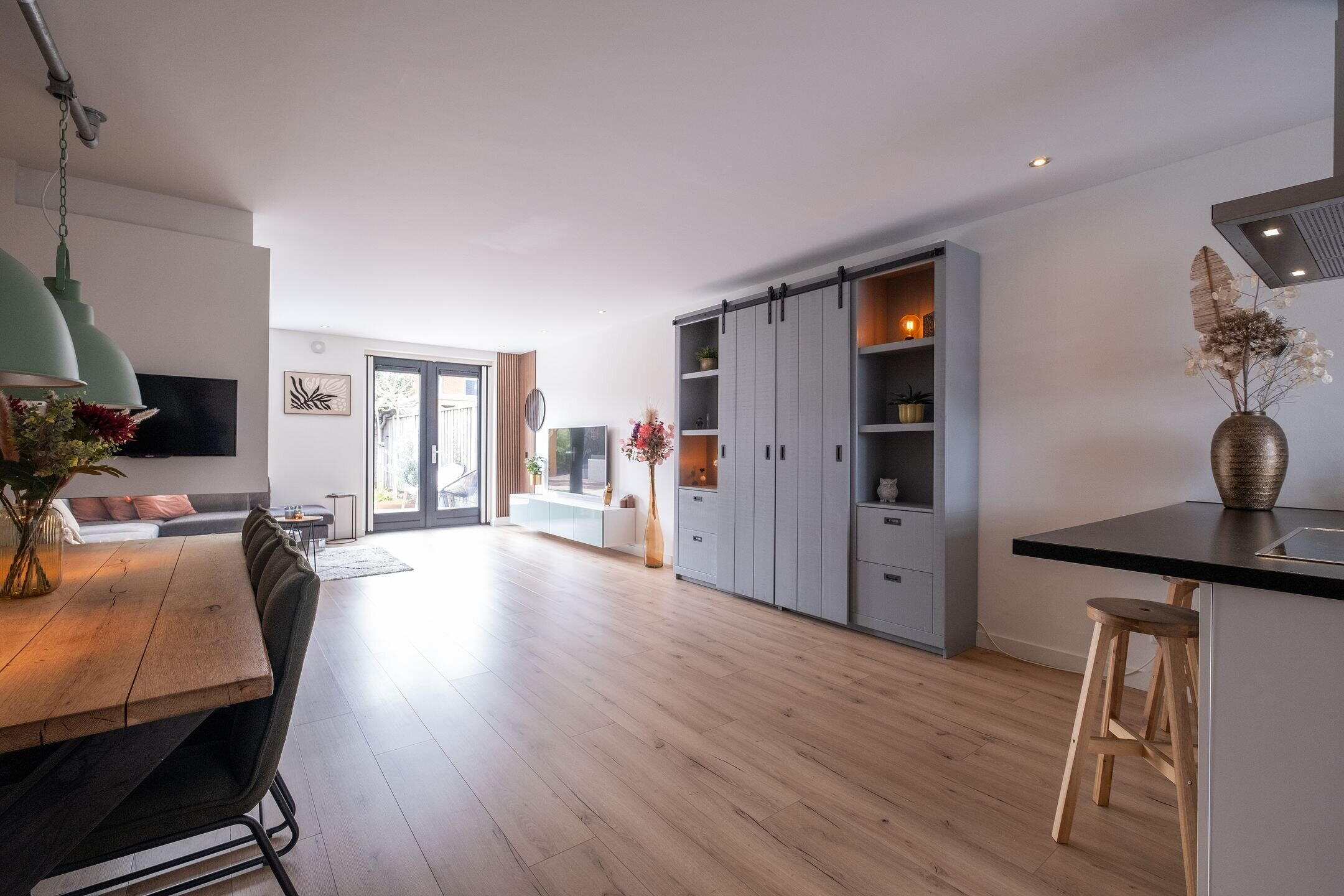 Via de entree kom je in de hal met meterkast en trapopgang. De woonkamer is door de uitbouw heerlijk ruim en licht, met openslaande deuren naar de tuin. De ruimte is strak afgewerkt met glad gestucte wanden en plafond, een laminaatvloer met vloerverwarming en een stijlvolle cinewall met gashaard en spotverlichting.