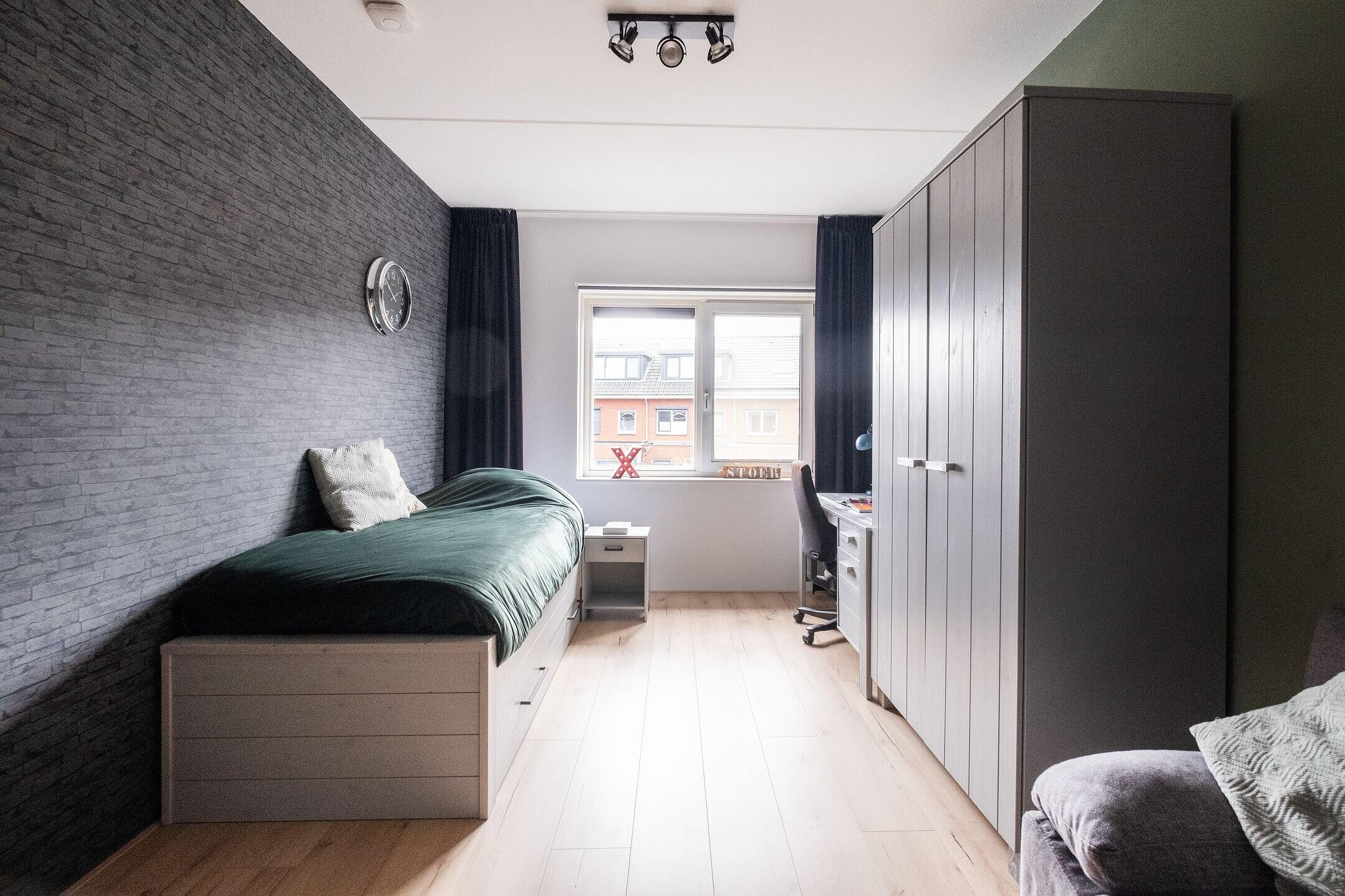 Op de eerste verdieping vind je drie slaapkamers, allemaal netjes afgewerkt met dezelfde laminaatvloer en renovliesbehang. De vloerverwarming is per kamer regelbaar, wat zorgt voor extra comfort. De slaapkamer aan de achterzijde is voorzien van een rolluik.