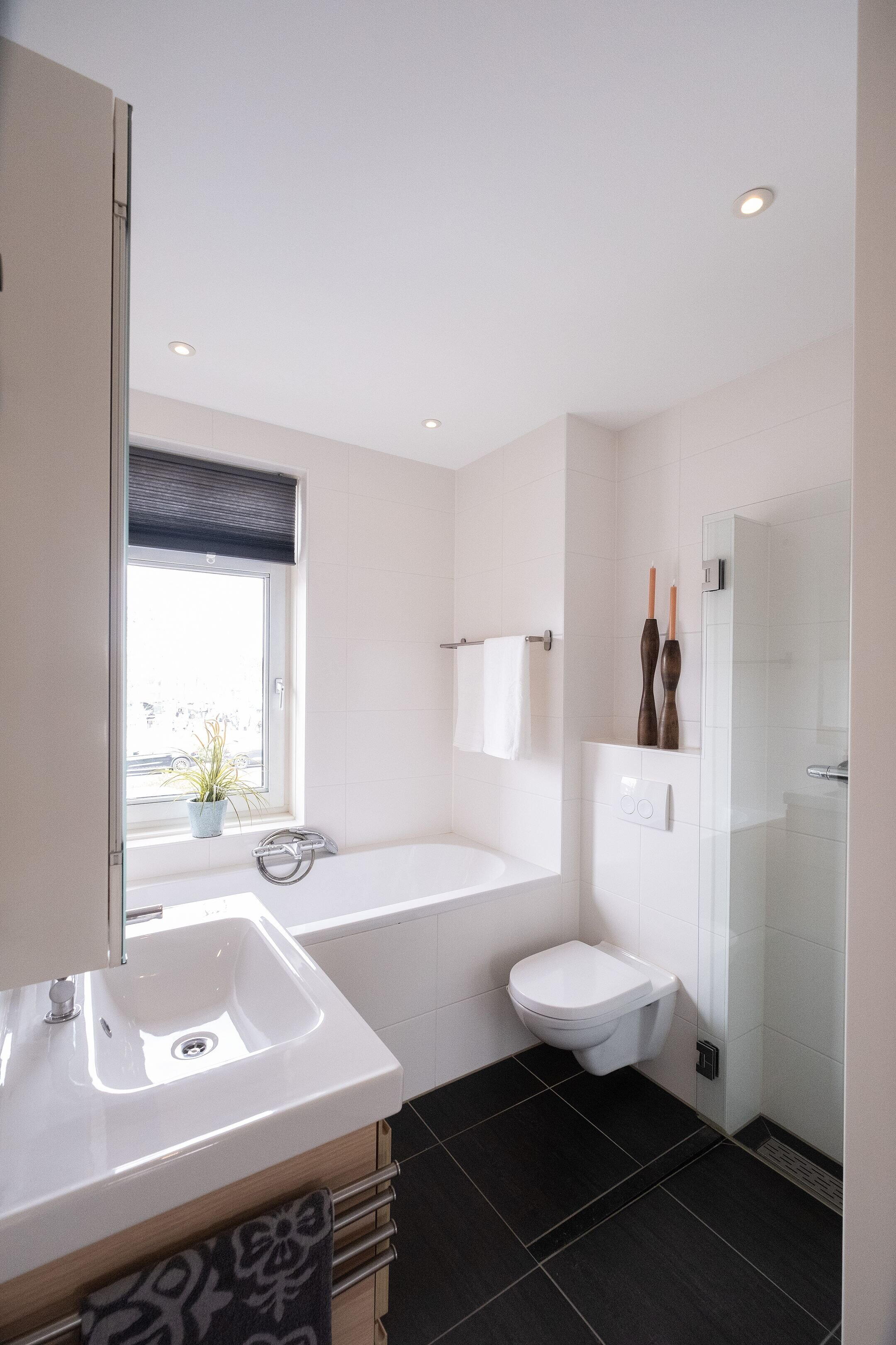 De badkamer is modern en compleet ingericht met een ligbad, inloopdouche, hangend toilet, wastafelmeubel, vloerverwarming en spotverlichting.