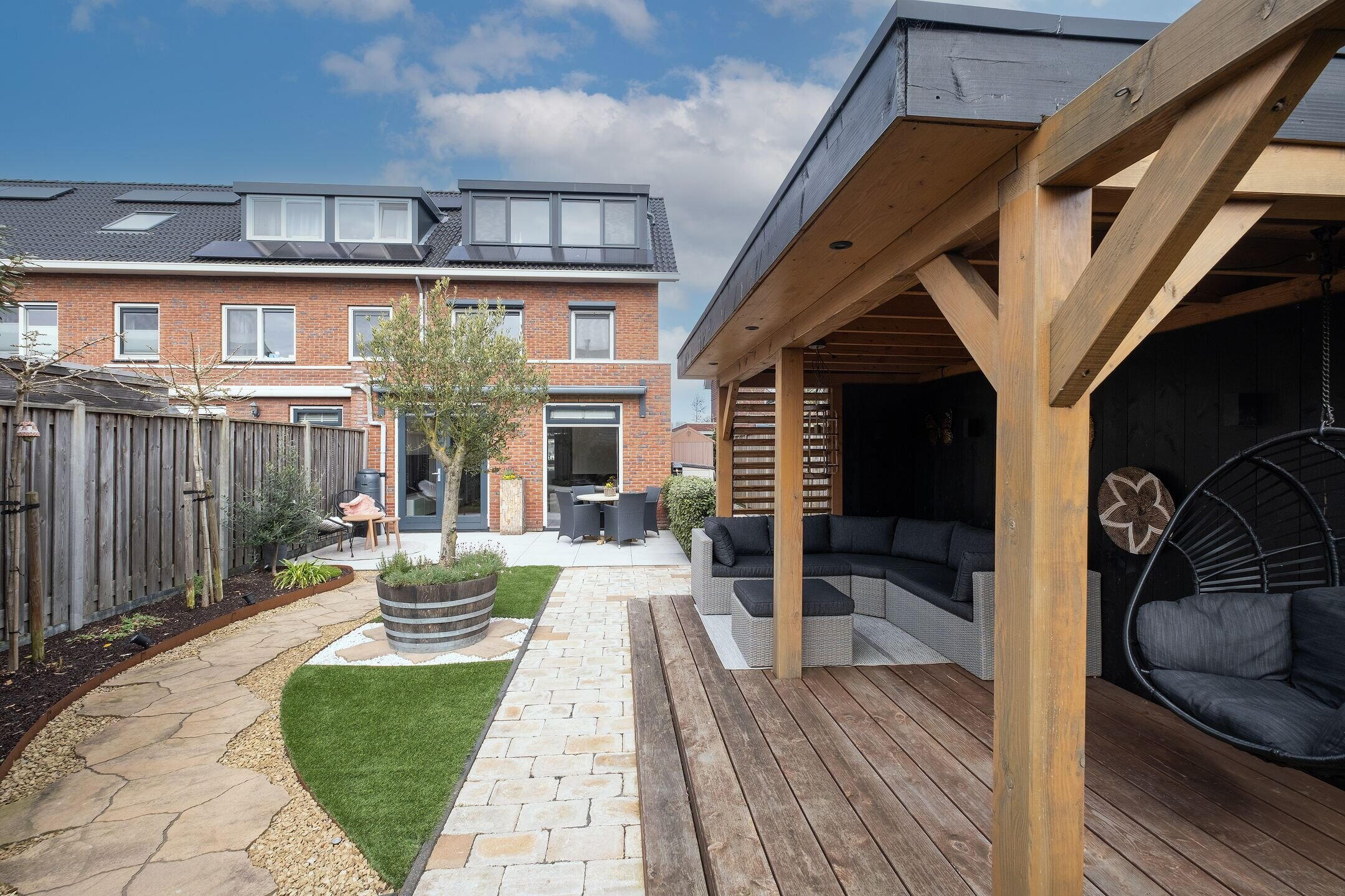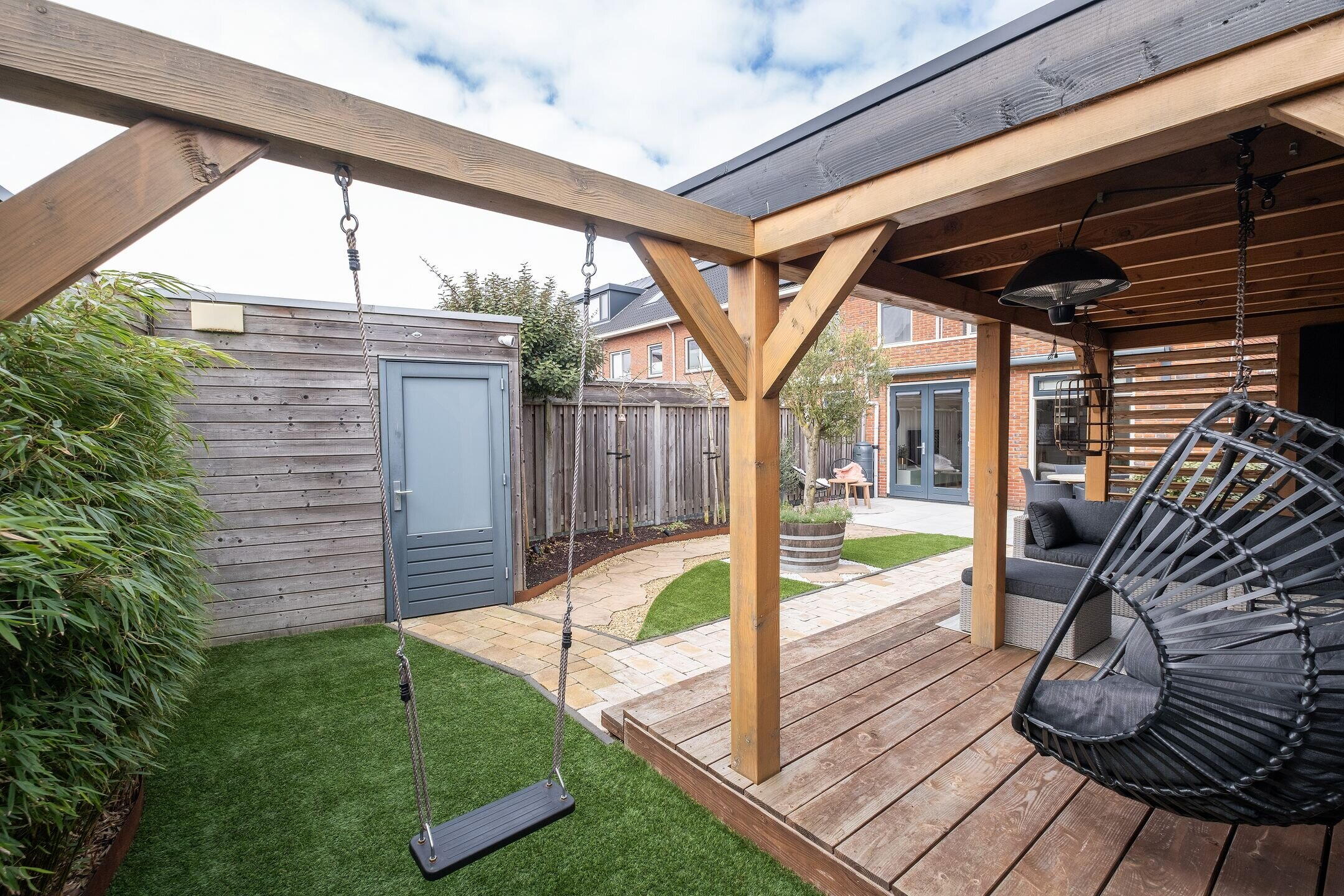 De achtertuin ligt gunstig op het zuiden en is fraai aangelegd met onder andere kunstgras, cortenstaal en een veranda. Hier geniet je volop van het buitenleven, met voldoende ruimte om te ontspannen of gezellig te zitten.