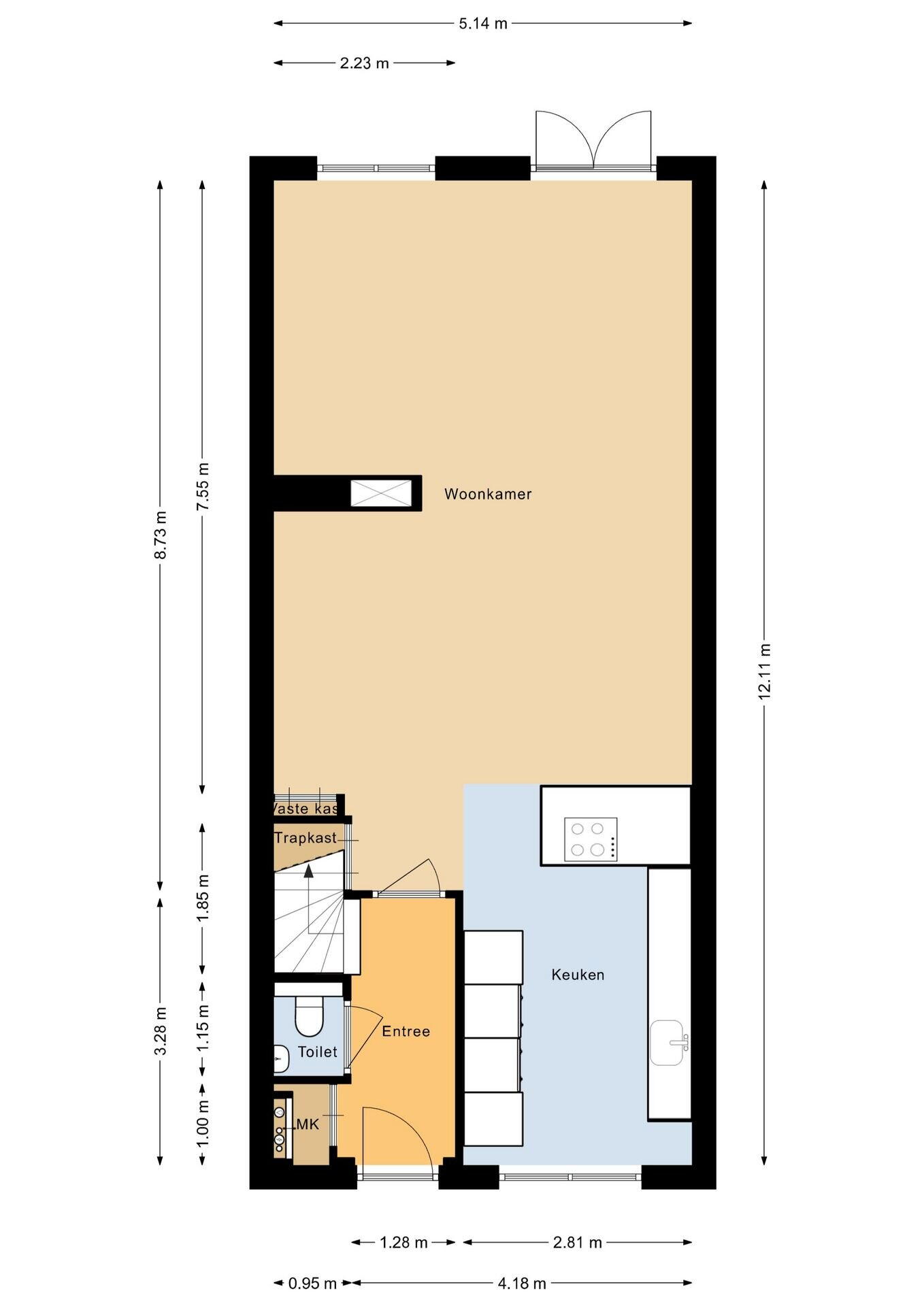 - 98 m² (12,40 meter diep en 7,90 meter breed)